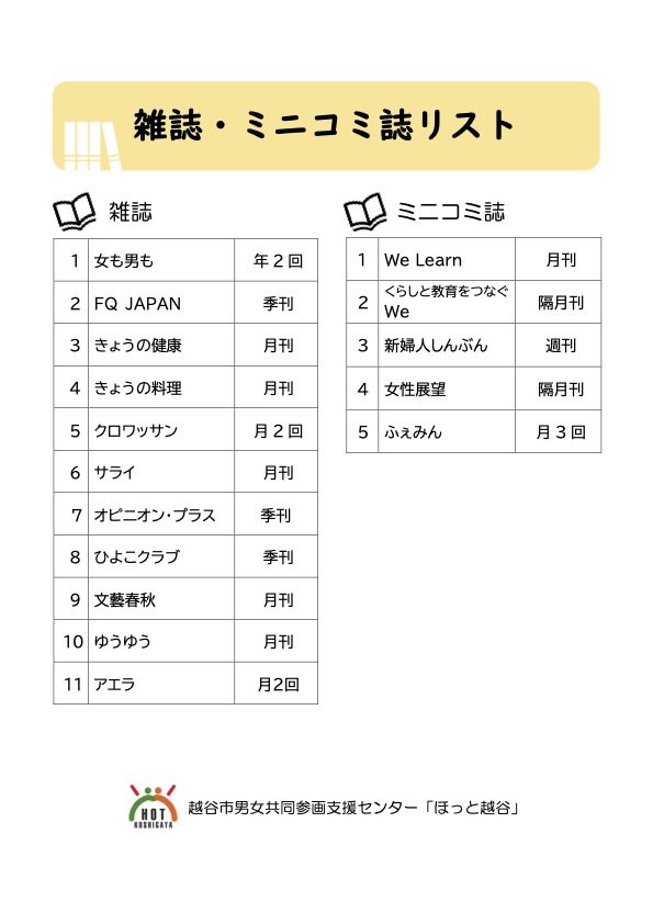 越谷市男女共同参画支援センター「ほっと越谷」は、指定管理者「街活性室株式会社」が管理運営しています。