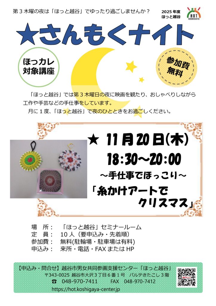 さんもくナイト~手仕事でほっこり~「糸かけアートでクリスマス」 毎月第3木曜日の夜は、映画や手仕事でいつもと違う時間をゆったりと過ごしてみませんか? 11月は糸かけアートでクリスマスオブジェを作ってみましょう。 参加費:無料 開催日: 11月20日(木) 時間: 18:30~20:00
