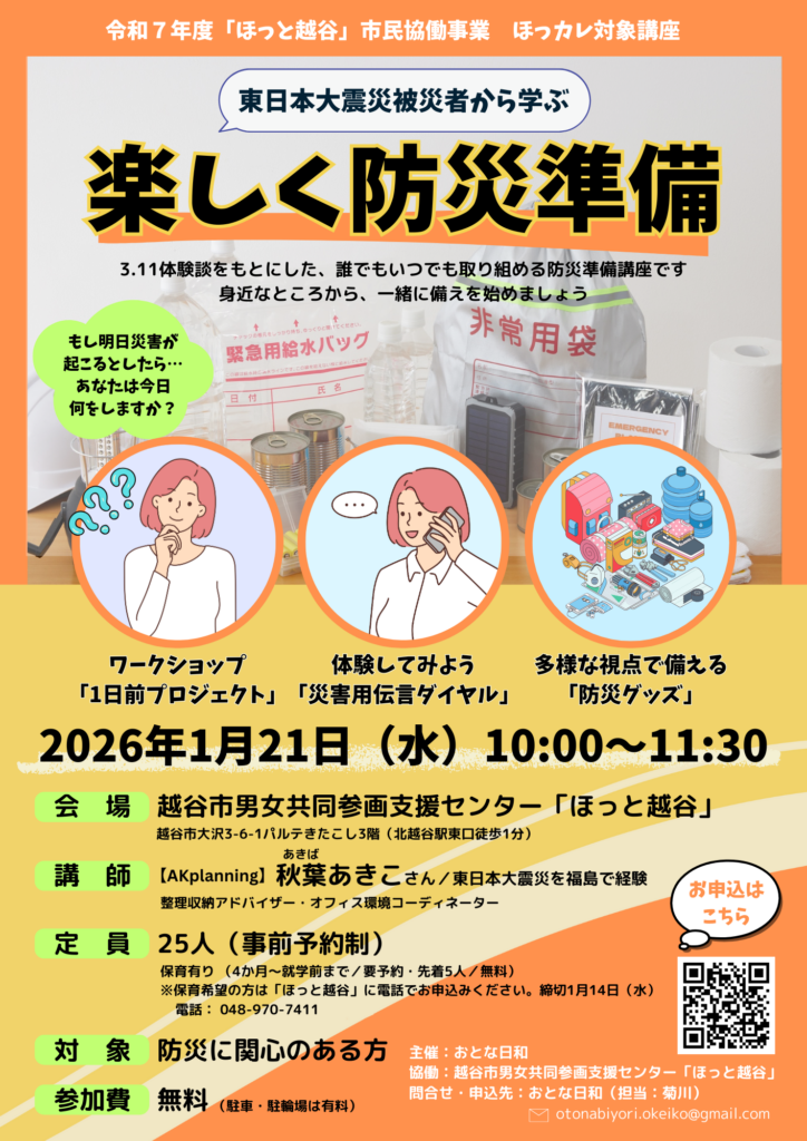 「もし災害の1日前に戻れたら、あなたは何をしますか?」東日本大震災被災者の体験談から学ぶ、備えの大切さ。災害用伝言ダイヤル、防災グッズの紹介など、身近なところから、誰でもいつでも取り組める防災準備について一緒に考える講座。