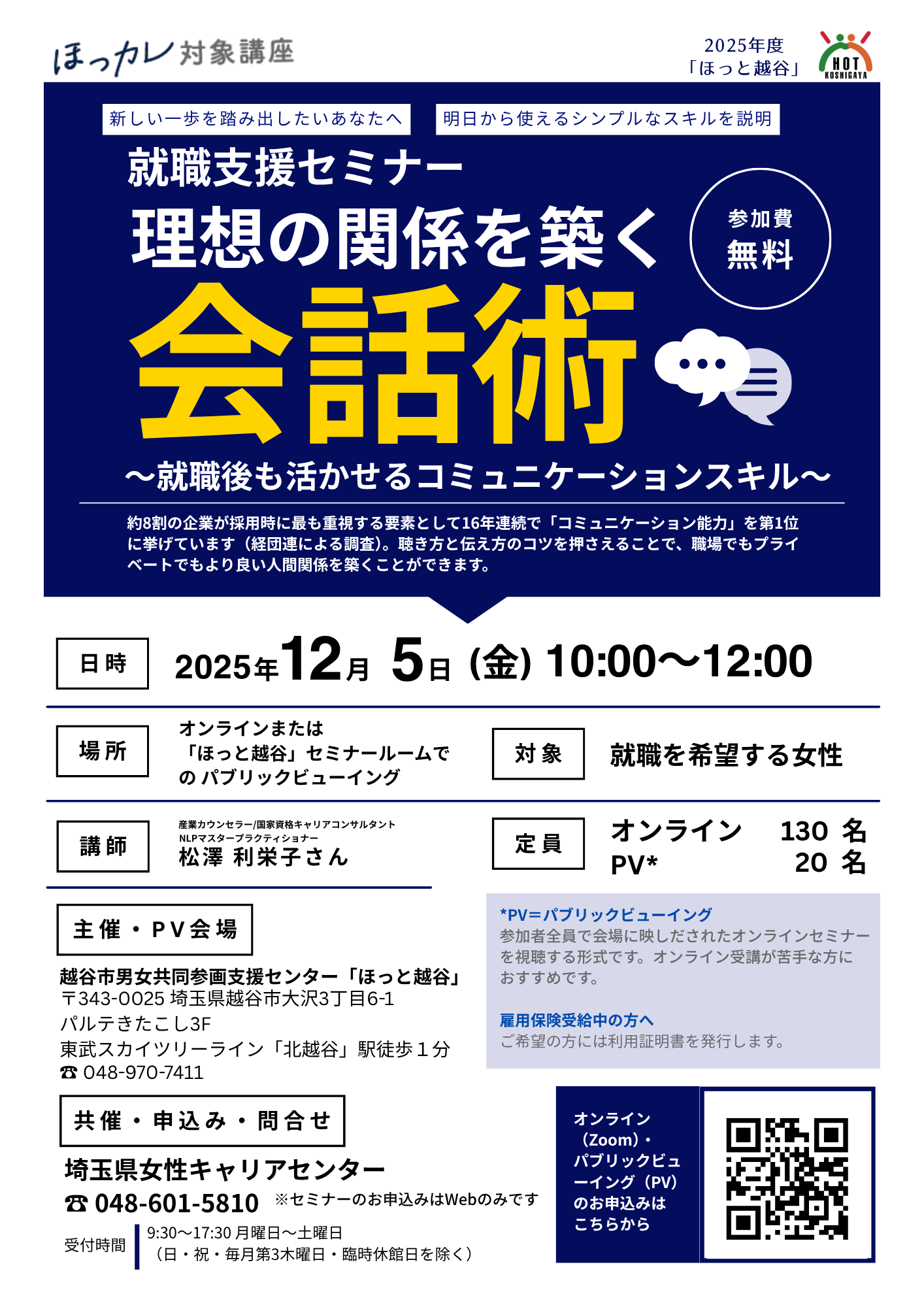 就職支援セミナー「理想の関係を築く会話術〜就職後も活かせるコミュニケーションスキル〜」 この講座は「ほっカレ」対象講座ですが、単位の付与は会場視聴(パブリックビューイング)参加のみとなります。 ※申込みは「埼玉県女性キャリアセンター」HPから