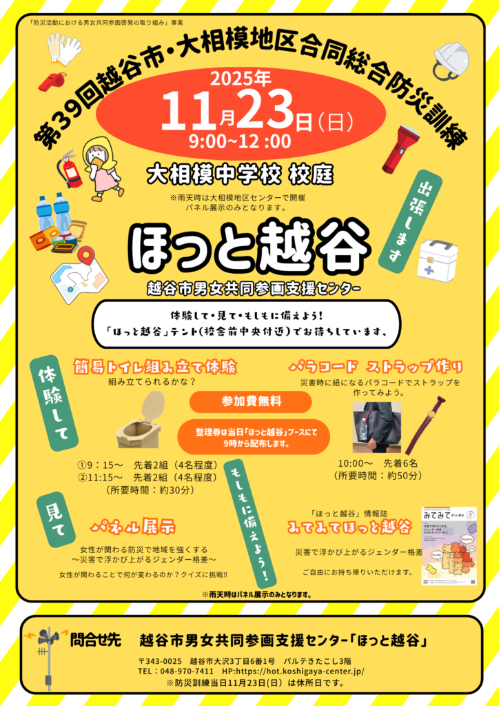 第39回越谷市・大相模地区合同総合防災訓練の「ほっと越谷」ブース(校舎前テント付近)では簡易トイレ組み立て体験やパラコードストラップ作り体験コーナー(参加費無料・先着順・整理券は当日「ほっと越谷」ブースにて9時から配布)や パネル展示(女性が関わる防災で地域を強くする~災害で浮かび上がるジェンダー格差~)を開催します。